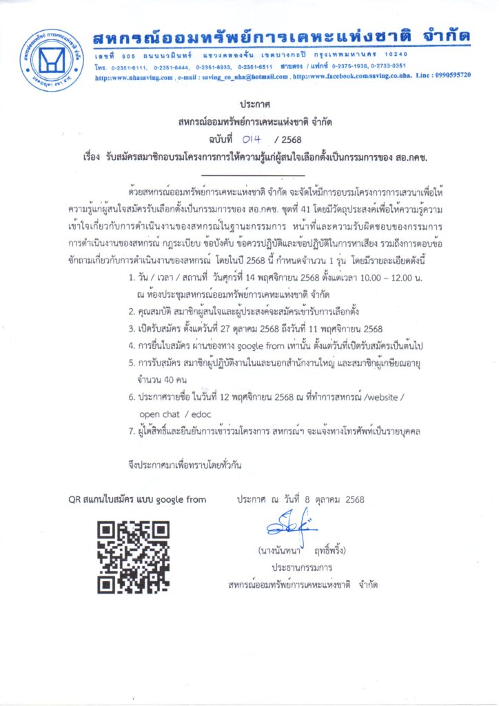 ประกาศฉบับที่ 014 / 2568  เรื่อง  รับสมัครสมาชิกอบรมโครงการการให้ความรู้แก่ผู้สนใจเลือกตั้งเป็นกรรมการของ สอ.กคช. ประจำปี 2568