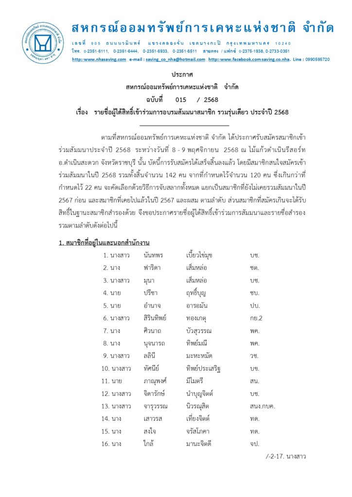 ประกาศฉบับที่ 015/ 2568  เรื่อง   รายชื่อผู้ได้สิทธิ์เข้าร่วมการอบรมสัมมนาสมาชิก รวมรุ่นเดียว ประจำปี 2568