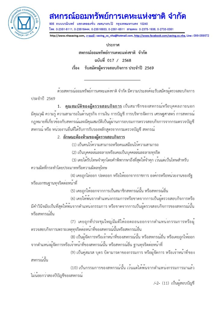• ประกาศฉบับที่ 017 เรื่อง รับสมัครผู้ตรวจสอบกิจการปี 69 24 พฤศจิกายน 2025