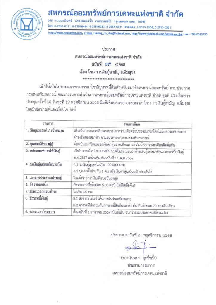 • ประกาศฉบับที่ 019 เรื่อง โครงการเงินกู้สามัญ(เพิ่มสุข) 24 พฤศจิกายน 2025