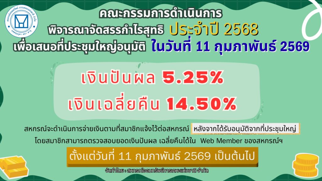 • ประกาศฉบับที่ 1/69 กำหนดเวลารับฝากเงินออมทรัพย์พิเศษ“ทรัพย์มั่นคง” 12 มกราคม 2026
